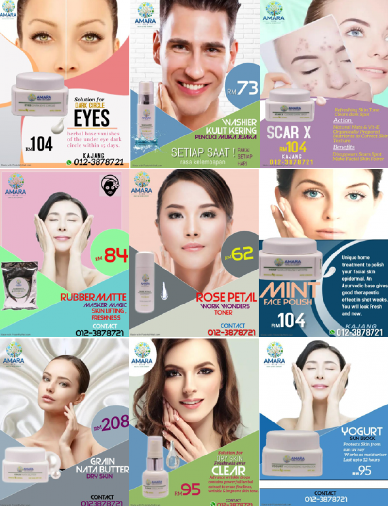 - Rubber Matte Skin Lifting - RM84.00 - Rose Petal Toner - RM39.00 - Grain Nata Butter Dry Skin - RM208.00 - Mint Face Polish - RM104.00 - Gloy Polish, Repairs & Give Glow to skin - RM73.00 - Washier for Oily Skin for Women - RM73.00 - Scar X - RM104.00 - Dark Circle Eye Solution - RM104.00 - Clear for Dry Skin - RM95.00 - Washier Kulit Kering for Men - RM73.00 - Yogurt Sun Block - RM95.00 Contact: Mr Rama Contact No : 012 387 8721