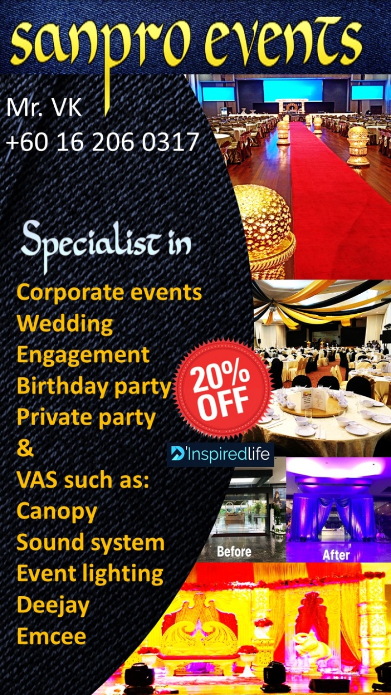 Event Management - Corporate & Private events planner expert - All kinds of decorations, backdrop setup and lighting - Canopy rental rental - (Transparent, Arabian style, Pyramid and marquee tent) - Table and chairs ( Plastic chair, Banquet Chair, Chiavari Chair, high chair and tables) - PA system with lightings Contact Person : Mr Vinesh VK (Director - Sanpro Events) Contact No : 016 - 2060 317
