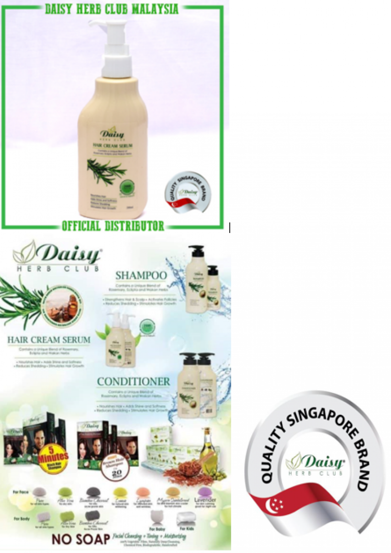 PRODUCT : DAISY HERB CLUB - Hair Cream Serum (Product Of Singapore) PRICE : RM29.00 per bottle CONTACT PERSON : Mr Muthukumar CONTACT NO : +6019 280 1818