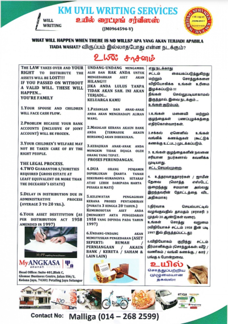 - Normal Charges for Will Writing is RM500.00/Will Contact Person : Ms Malliga Ramudu Contact No : 014 - 268 2599